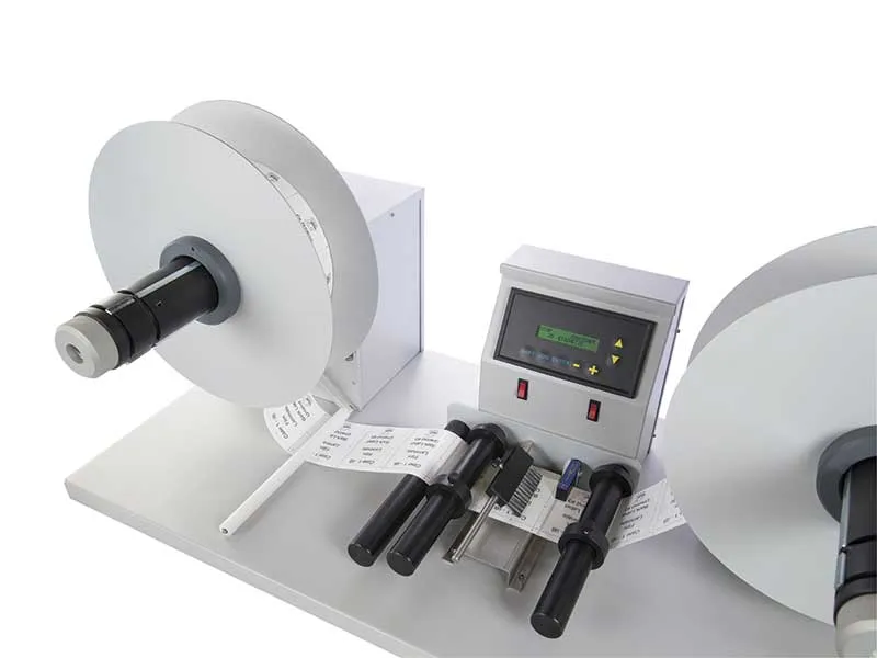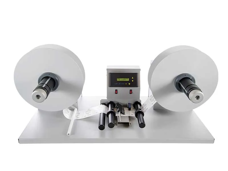 En la función de rebobinador, permite rebobinar etiquetas partiendo de bobinas de diámetro máximo de 300 mm rebobinadas interna o externamente, se adapta a mandriles de 76 mm, con rollo de un diámetro máximo de 300 mm con bobinado interno o externo. La velocidad media de rebobinado es de más de 50 metros/minuto.